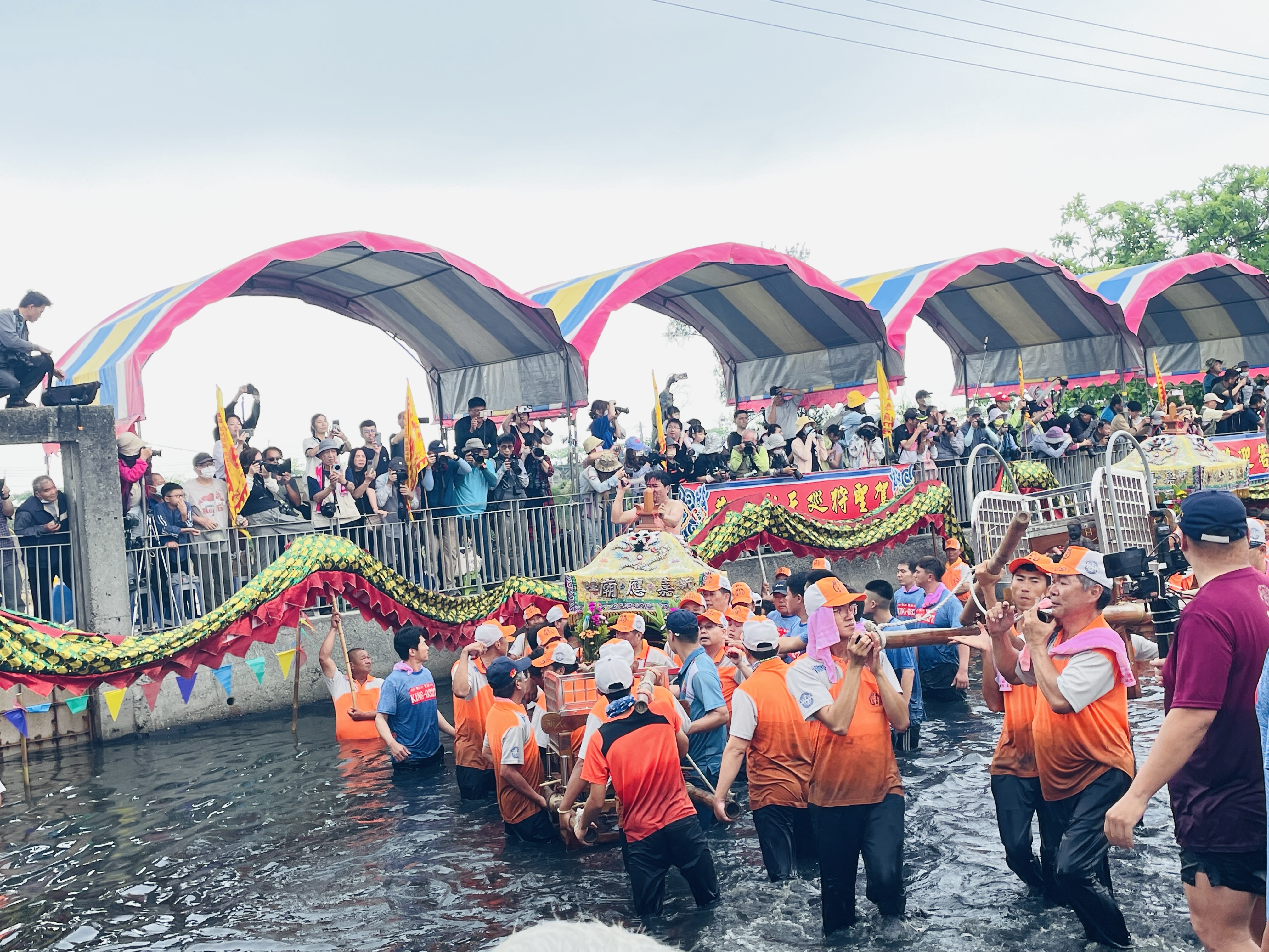 香煙裊裊,鼓聲震天,眾人的心也隨著這一刻一同屏息。就在此時,科儀來到最高潮——眾神感應到巡山與巡海客王即將抵臨,主神尹王爺的神轎率先昂然衝入及腰深的水道。木轎與水花激烈相撞,轎班子弟們咬緊牙關、奮力向前。水的阻力化作一道無形的試煉,既象徵迎接客王的艱辛與莊重,更是對神明最深切的敬意。那一刻,水聲、鼓聲與眾人的吶喊交織成一場壯闊的交響,不只是信仰的展演,更是整個社區心靈的凝聚。年輕子弟奮力抬轎,展現青春與血性的力量;長者則在旁領喊、指揮,穩健而睿智,承載著世代傳承的智慧。信仰,在這一刻,具象為最深厚的文化認同。「哎!你們也來看熱鬧啊!這裡比較好站,快過來!」忽然,一個熟悉的聲音從人群中傳來。我和懿儒循聲望去,原來是我們熟識的承霖大哥,他熱情地揮手,邀我們到更佳的視角觀看。這一句招呼,讓我們在熱鬧滾滾的場域裡,倍感地方的溫暖與親近。