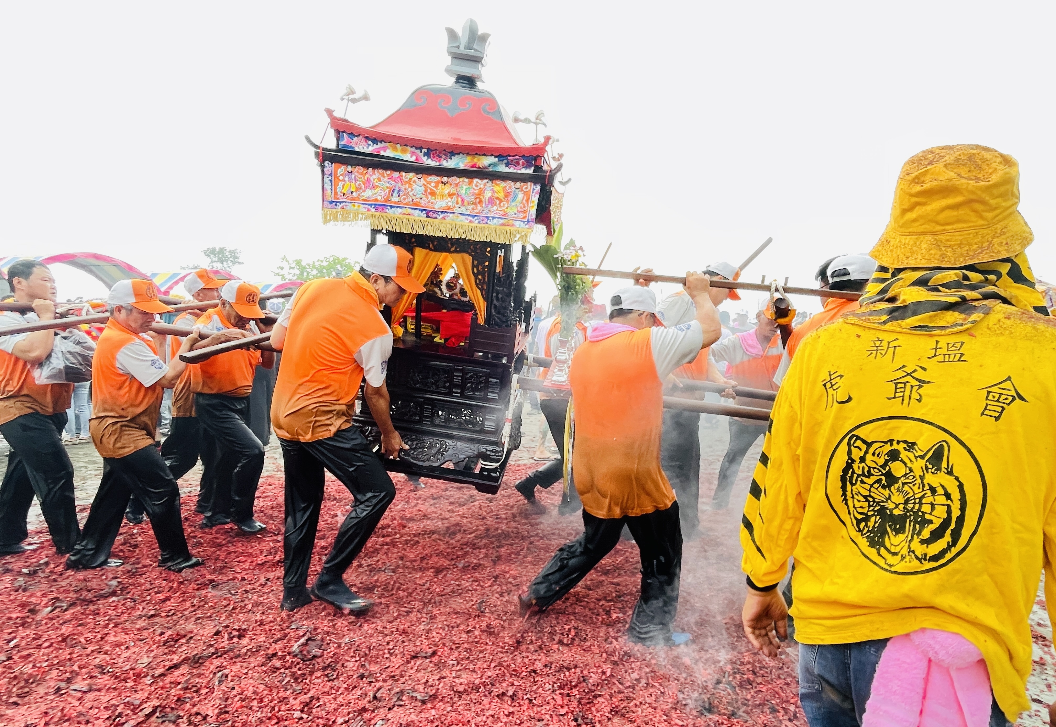 此時此刻,身邊的空氣似乎也因為人群的期待而變得熱騰騰的。孩子興奮地牽著長輩的手,老人則靜靜低聲喃唸祈福的話語。大街小巷裡,每個人都懷抱著同樣的心意:迎神,不僅是科儀與傳統,更是一份凝聚社區的情感,是世代相傳的生命記憶在此刻的再度甦醒。步行不過五分鐘,眼前的景象便在我們面前徐徐展開。嘉應廟尹王爺的神轎巍然矗立,朱紅與鎏金交織的轎簾隨風輕揚,香煙繚繞,氤氳出一種莊嚴而神秘的氣息。那一刻,仿佛連空氣都染上了檀香與神明的威儀。隨著時間推移,鄰近村落與遠道而來的神轎一頂又一頂湧入「客王窟」(王船碼頭)。鼓聲轟隆,號角齊鳴,整個新塭在此刻完全沸騰,像是沉睡已久的村莊被喚起。