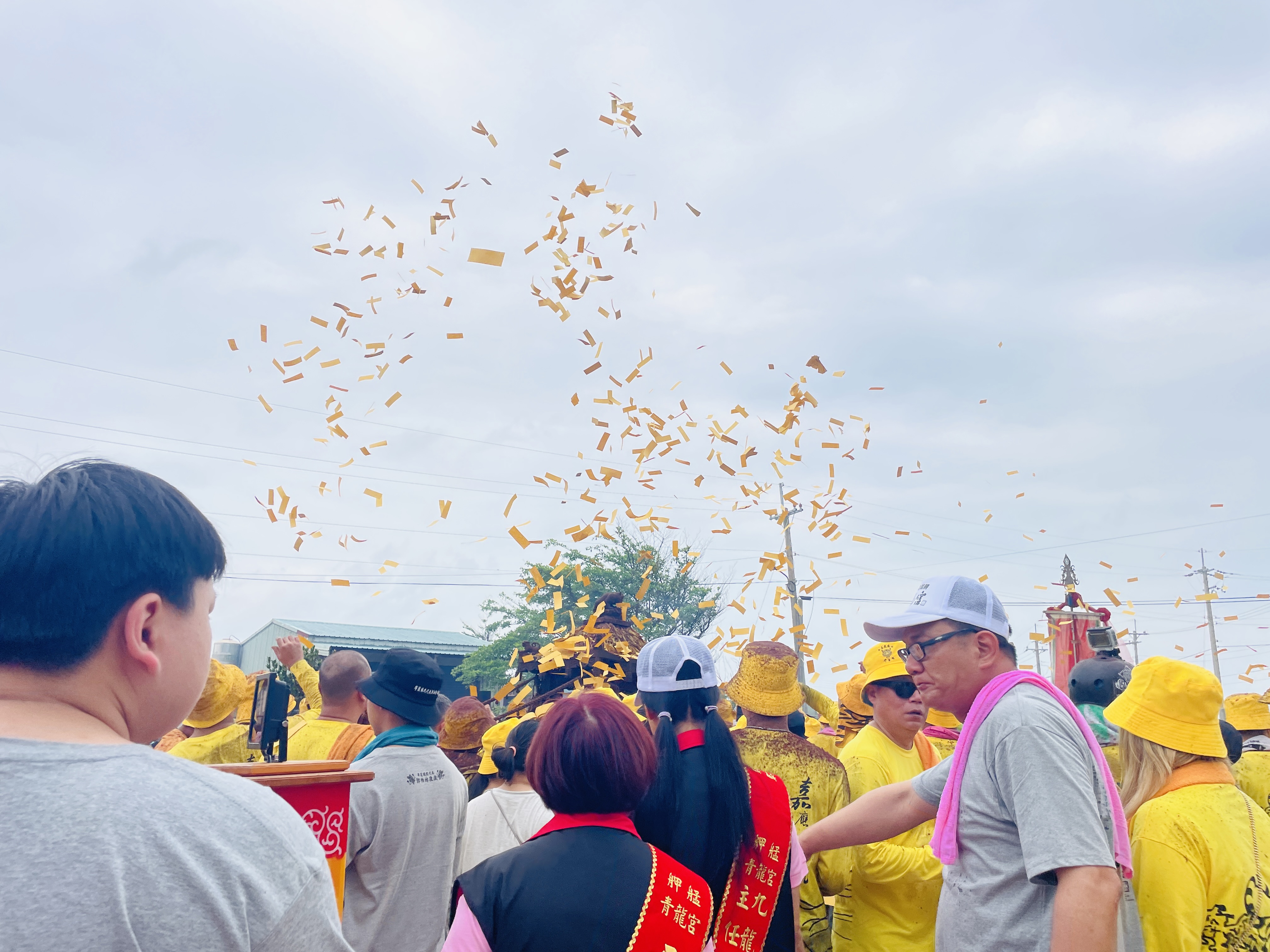 近兩個多小時的科儀,逐漸走向尾聲。當主神尹王爺迎回巡山、巡海客王,完成神聖的「衝水路」儀式後,轎班子弟們小心翼翼地將神轎抬上岸,再緩緩踏上回鑾之路。沿著西濱公路的新塭大街,人潮早已水泄不通。信徒們自然而然地跪伏在地,不分男女老幼,人人雙手合十,眼神虔誠而篤定。當神轎行經之際,滿天的「古仔錢」隨風灑落,金黃色的紙片像細雨般飛舞,閃耀著祝福與庇佑的光芒。我與懿儒彼此竊竊私語,身旁的一位在地耆老微笑解釋:「這是神將出巡撒的古仔紙,祈求平安、開道的意思啊!」簡單的一句話,卻讓我們心頭一暖。原來,田野裡不僅是觀察與紀錄,更是一次次自然發生的「機會教育」。