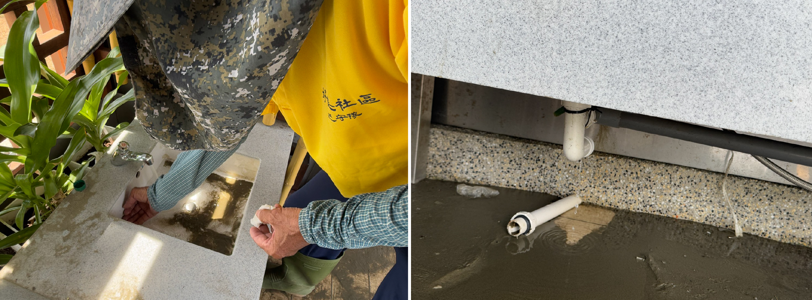 圖8左、右:阿舅清洗廁所的洗手台及拍照損害管線並上傳系統回報。