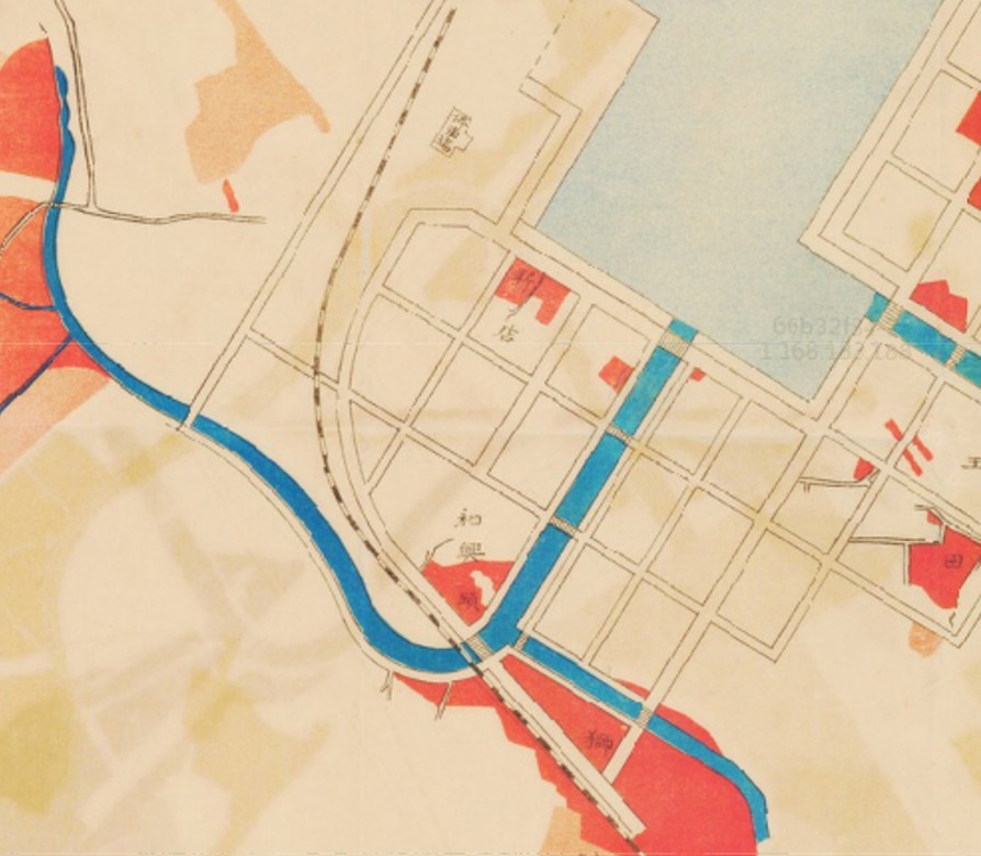 圖2:由1912年臺灣建物株式會社基隆土地一覽圖,可清楚看出西定河(畫面左側)、南榮河(畫面右側)所匯流而成的旭川運河(來源:中研院「基隆百年歷史地圖」系統)