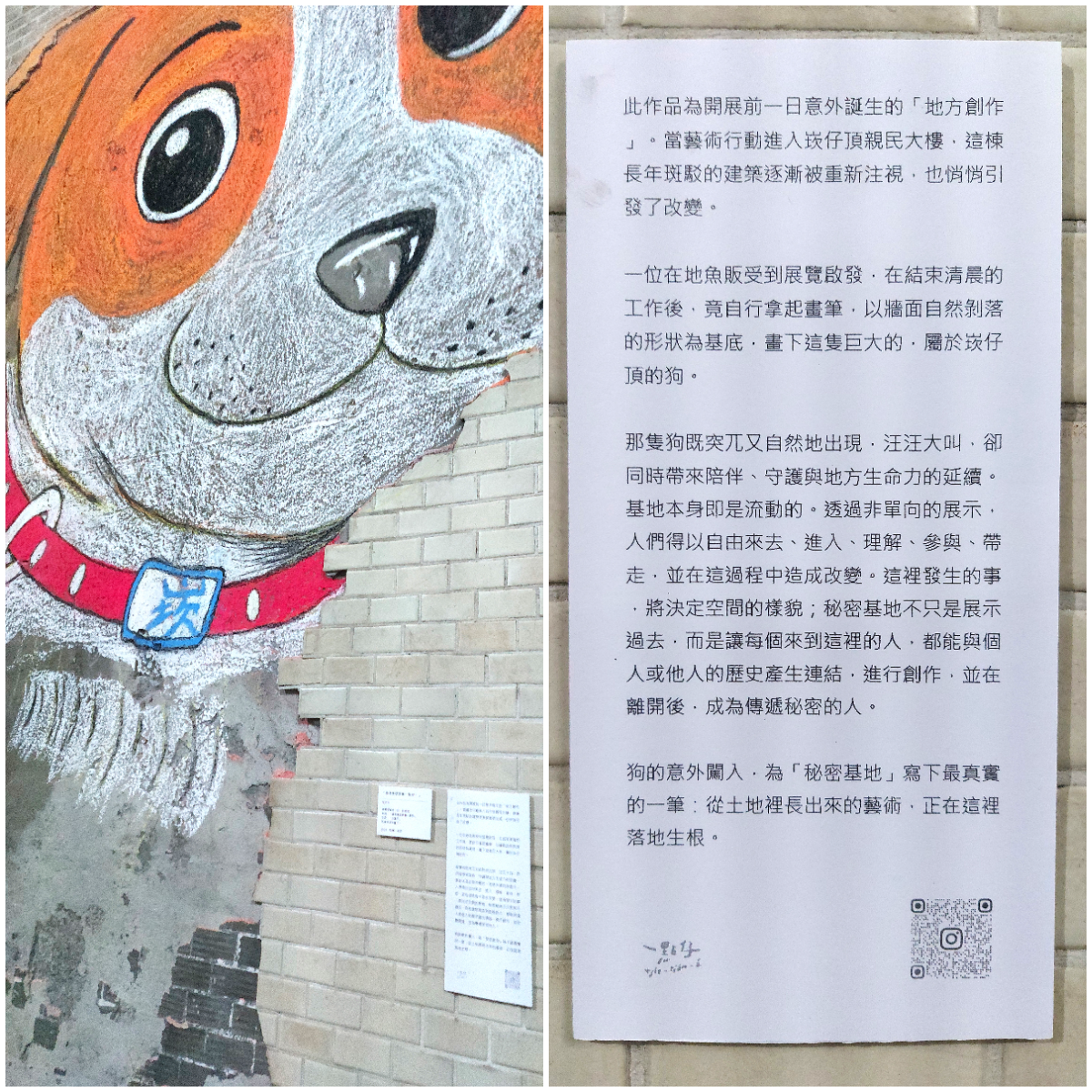 進入三連棟之初,曾有基隆團隊提醒此處凝聚力低、店家流動率高,在地認同未能成形。因此幾個合辦單位在開展前,已多次向當地商家住戶們說明、介紹展覽並預告可能產生的擾動,以爭取理解和包容。然而,實際的在地回饋卻出乎意料:當海大師生進入協助整理大樓展場時,在地民眾紛紛探問關懷,慷慨出借水桶、水源、清潔用品等;藝術家進駐佈展期間,亦獲得協助與溫暖鼓勵,更有住戶迫不及待拍下展品的製作過程。連樓下崁仔頂魚市的小哥也忍不住技癢,開展前一天在牆壁磁磚剝落處繪上兩隻大狗,成為意外的「地方創作」。這讓我們確信許多人其實是外冷內熱,他們也在乎住居環境、公共空間的整潔美好,以及此地是否有熱絡的人情與活力。