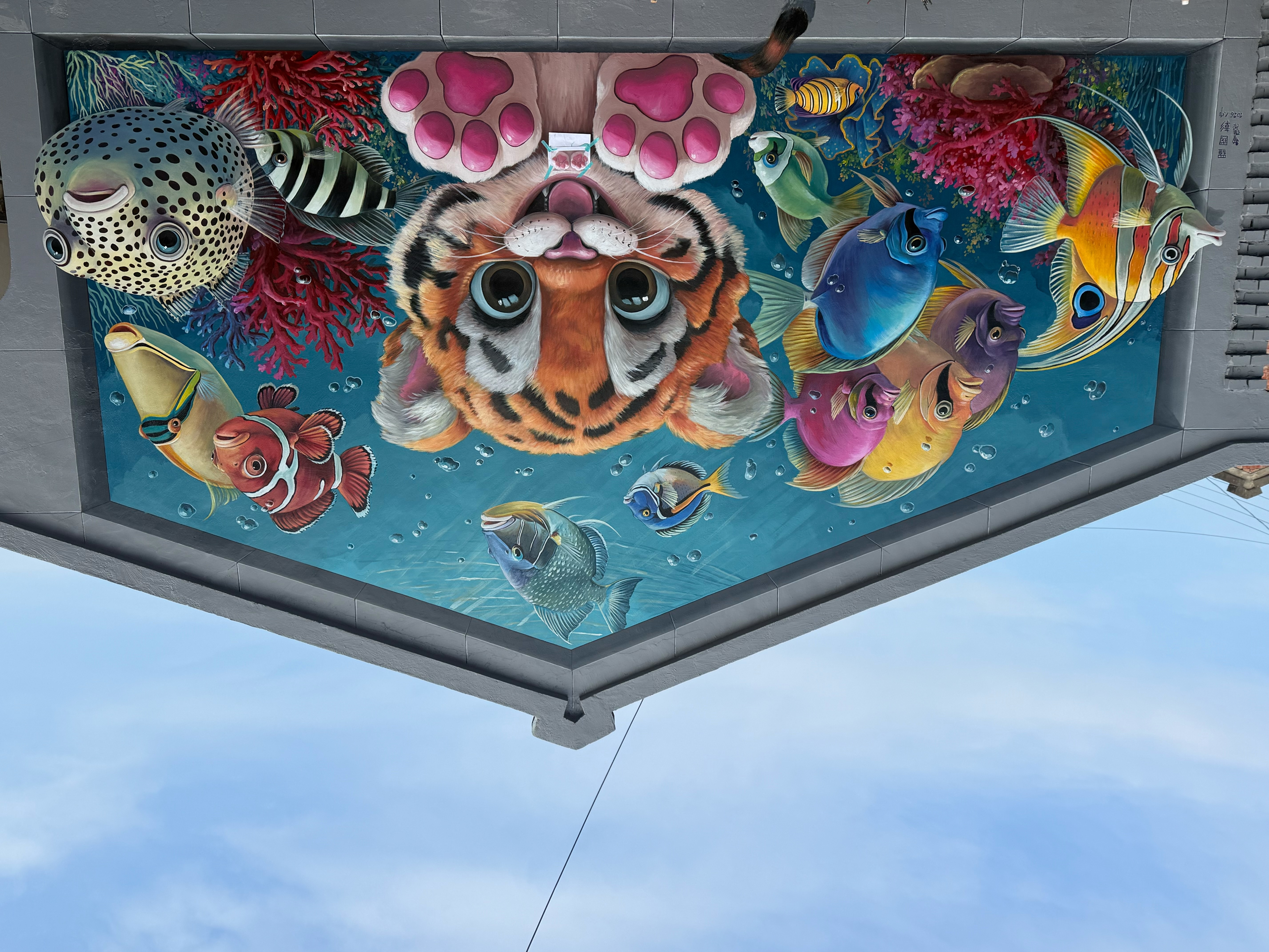 談到畫作本身,曾老師進一步解釋其象徵意涵。畫中的老虎,其實象徵著國彰本人,而那隻向外伸出的爪子,正是他與世界連結的方式。透過這個動作,國彰不再只是站在世界的一側,而是主動觸碰、感受、回應這個世界。畫面周圍繽紛的熱帶魚,象徵著好美里(虎尾寮)豐富的海洋資源與漁村意象。整幅作品刻意使用較多暖色調,讓色彩相較於好美里其他壁畫,更加溫暖、柔和。而畫面中的氣泡,則象徵藝術與外界之間沒有玻璃隔閡,創作者以一種開放的心態,透過藝術與世界對話。這幅畫並不提供單一詮釋,而是成為一個邀請社區參與解讀的公共文本。藝術在此不只是被觀看,而是被討論、被猜測、被重新理解。