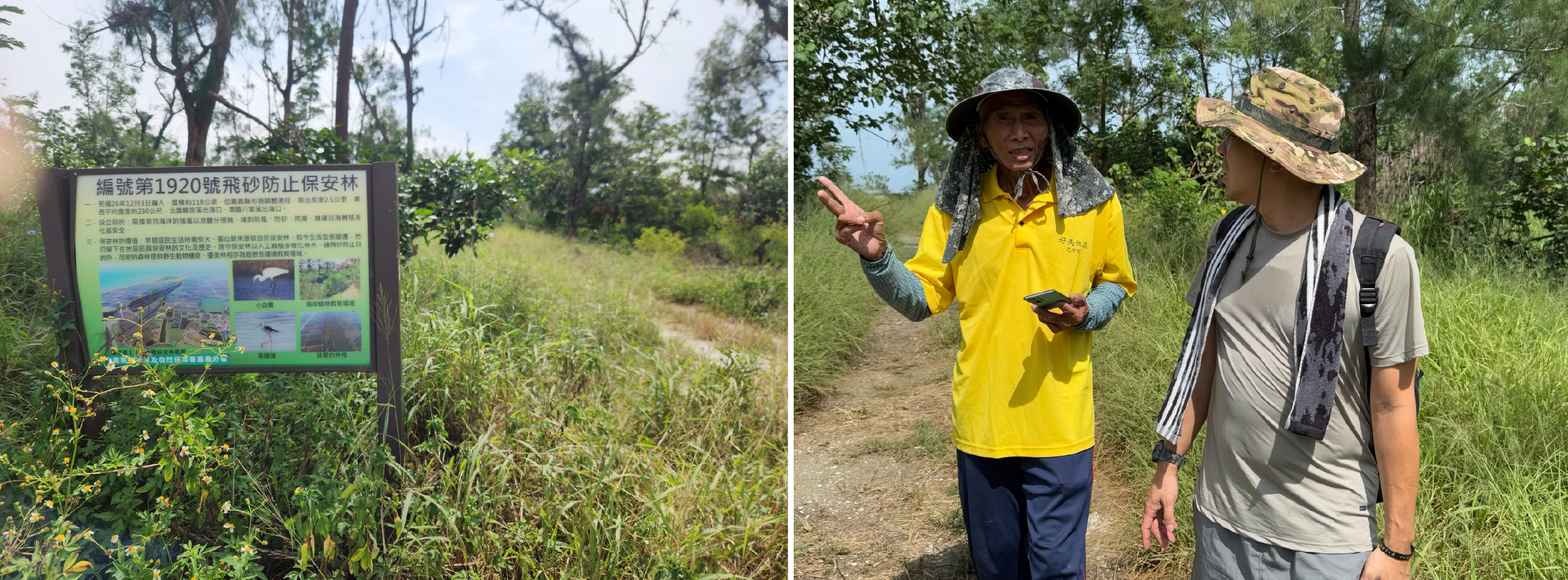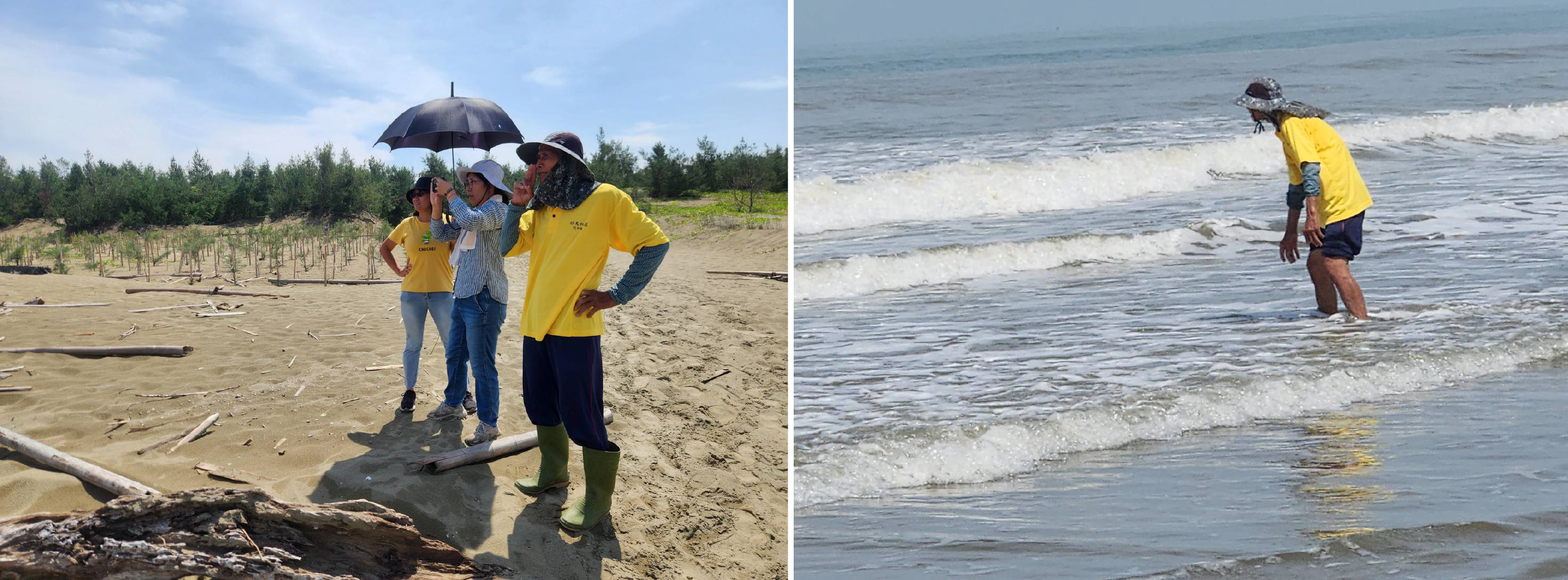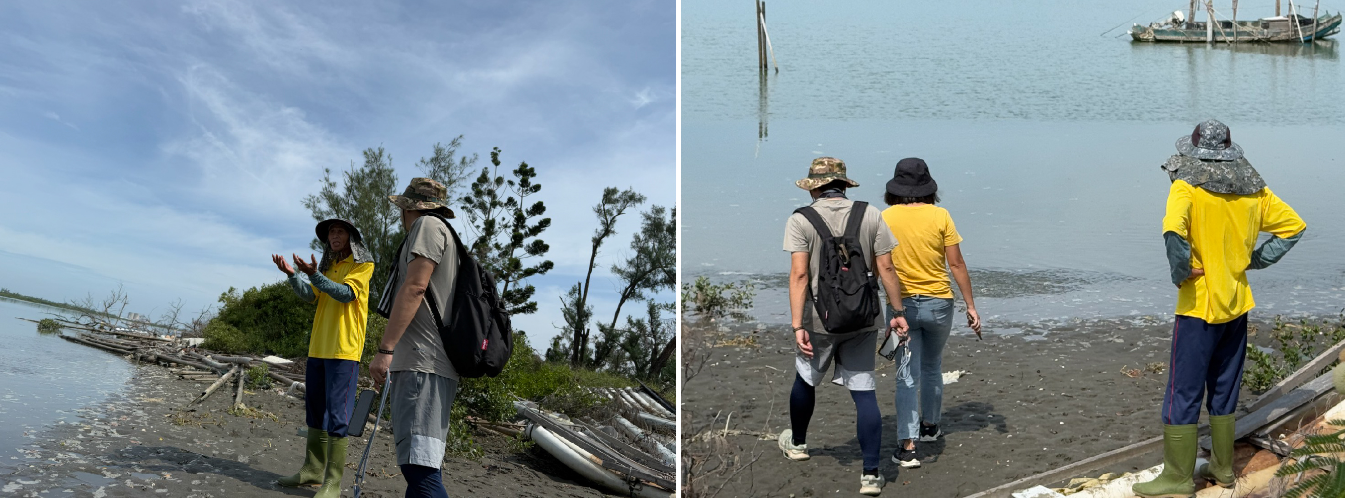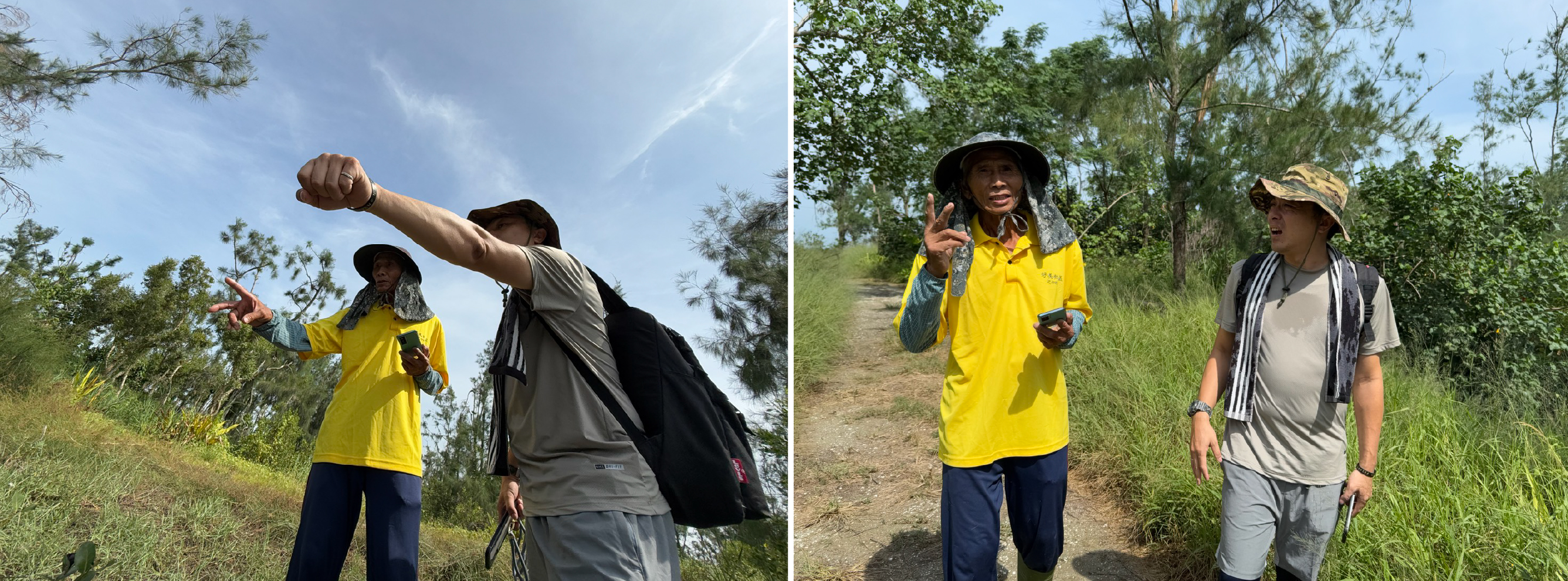 然而,在這些榮耀之外,還有另一種安靜卻動人的風景——那就是「黃色小飛俠」的日常身影。阿舅的熱情,彷彿映照著布袋的驕陽,耀眼卻不刺眼,讓人心生安心。在閒聊中我們才知道,他與七、八個在地居民受託協助農業部林業及自然保育署嘉義分署,肩負巡守1920美漾森林、龍宮溪河口與好美沙灘的任務。雖然津貼微薄,不足以彌補他付出的辛勞,但對阿舅而言,這並非一份工作,而是一種深刻的使命。他常掛在嘴邊的一句話是:「自己的土地,自己來守護。」這不是口號,而是一種發自心底的執著與念舊情懷。在烈日炙烤下,他的汗水常順著臉龐滑落,滲進衣衫,但他的步伐從不曾遲疑。他撿拾垃圾、拍照紀錄、檢查生態,一次又一次地將守護化作日常。阿舅,不僅是森林、河口與沙灘上的巡守員,更是在地文化與環境的守護者。他甚至熱情邀約我們:「9月19日,我有巡守任務,你們三個就跟著我出任務吧!」那一刻,我們看見的,不僅是一位社區長者的背影,而是一名文化行者的身影——用一生的熱情與信念,守護著他所愛的虎尾寮土地與海洋。