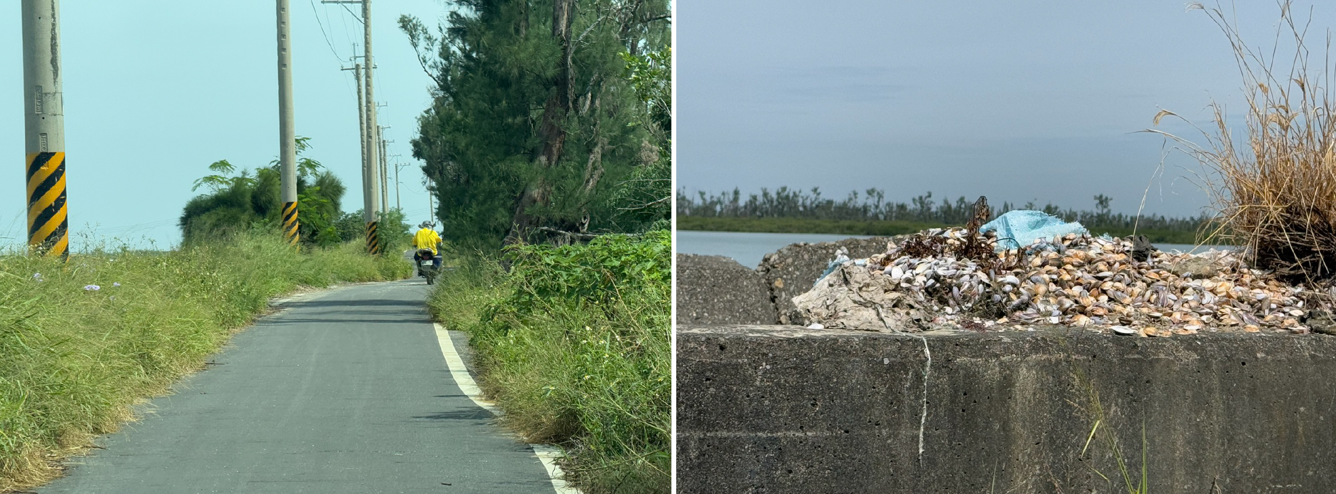 巡守了將近半小時,我們的腳步漸漸靠近森林入口。微涼的林風拂過額頭,帶著潮濕的青草氣息,讓人心神微定。然而,就在我們還沉浸於自然的呼吸與自我思索之際,阿舅忽然像隻矯健的鷹般,一個利落的動作躍上他的276野狼摩托車。伴隨著引擎的轟鳴,他那襯著陽光的鮮黃制服在鄉間小路上劃出一道亮眼的弧線,帥氣的背影迅速消失在荒草叢生的盡頭,只留下揚起的塵土與我們驚訝的目光。我們連忙追趕,氣喘吁吁地踏上鄉間道路。沿途所見,卻讓心頭猛然一緊——堤防邊堆積如山的蛤蠣殼,像一座座無聲的廢墟,曝曬在烈日下,散發著刺鼻氣味。那景象觸目驚心,像是大地在用最直白的方式訴說著人與環境失衡的代價。