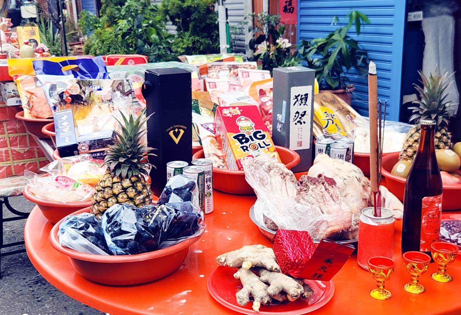 圖:新塭街道兩旁早已擺滿豐盛的祭祀香案